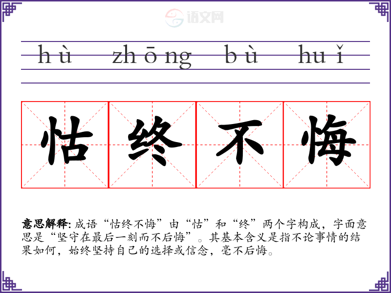 成语“怙终不悔”由“怙”和“终”两个字构成,字面意思是“坚守在最后一刻而不后悔”。其基本含义是指不论事情的结果如何,始终坚持自己的选择或信念,毫不后悔。