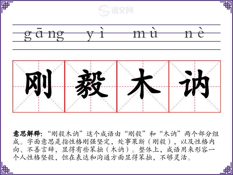“刚毅木讷”这个成语由“刚毅”和“木讷”两个部分组成。字面意思是指性格刚强坚定,处事果断(刚毅),以及性格内向、不善言辞,显得有些笨拙(木讷)。整体上,成语用来形容一个人性格坚毅,但在表达和沟通方面显得笨拙,不够灵活。