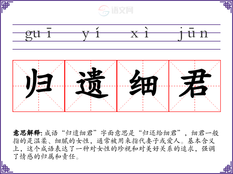 成语“归遗细君”字面意思是“归还给细君”,细君一般指的是温柔、细腻的女性,通常被用来指代妻子或爱人。基本含义上,这个成语表达了一种对女性的珍视和对美好关系的追求,强调了情感的归属和责任。