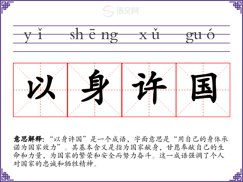“以身许国”是一个成语,字面意思是“用自己的身体承诺为国家效力”。其基本含义是指为国家献身,甘愿奉献自己的生命和力量,为国家的繁荣和安全而努力奋斗。这一成语强调了个人对国家的忠诚和牺牲精神。