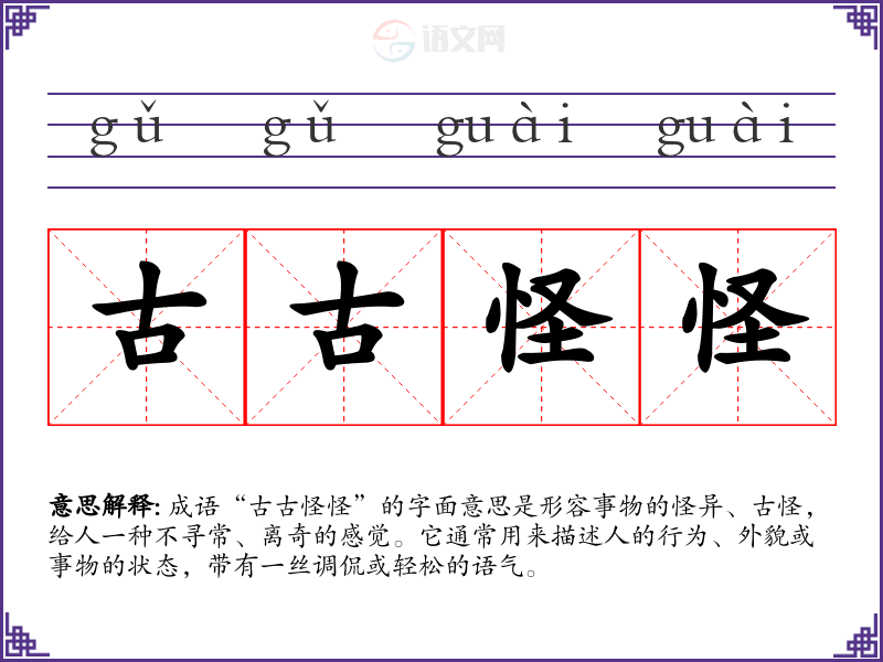 成语“古古怪怪”的字面意思是形容事物的怪异、古怪,给人一种不寻常、离奇的感觉。它通常用来描述人的行为、外貌或事物的状态,带有一丝调侃或轻松的语气。