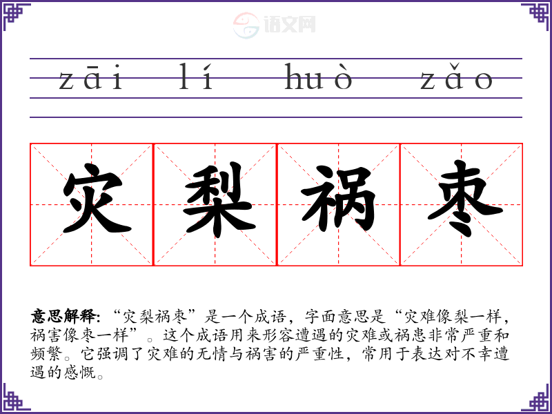 “灾梨祸枣”是一个成语,字面意思是“灾难像梨一样,祸害像枣一样”。这个成语用来形容遭遇的灾难或祸患非常严重和频繁。它强调了灾难的无情与祸害的严重性,常用于表达对不幸遭遇的感慨。