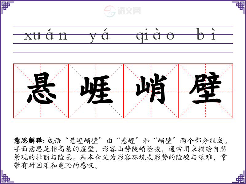 成语“悬崕峭壁”由“悬崕”和“峭壁”两个部分组成。字面意思是指高悬的崖壁,形容山势陡峭险峻,通常用来描绘自然景观的壮丽与险恶。基本含义为形容环境或形势的险峻与艰难,常带有对困难和危险的感叹。