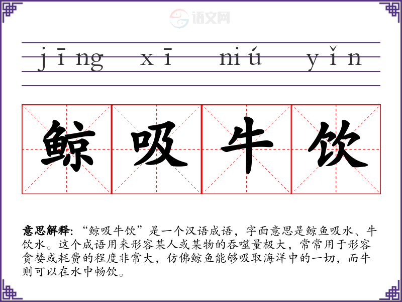 “鲸吸牛饮”是一个汉语成语,字面意思是鲸鱼吸水、牛饮水。这个成语用来形容某人或某物的吞噬量极大,常常用于形容贪婪或耗费的程度非常大,仿佛鲸鱼能够吸取海洋中的一切,而牛则可以在水中畅饮。