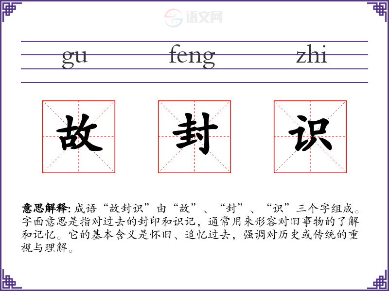 成语“故封识”由“故”、“封”、“识”三个字组成。字面意思是指对过去的封印和识记,通常用来形容对旧事物的了解和记忆。它的基本含义是怀旧、追忆过去,强调对历史或传统的重视与理解。