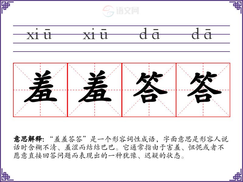 “羞羞答答”是一个形容词性成语,字面意思是形容人说话时含糊不清、羞涩而结结巴巴。它通常指由于害羞、忸怩或者不愿意直接回答问题而表现出的一种犹豫、迟疑的状态。
