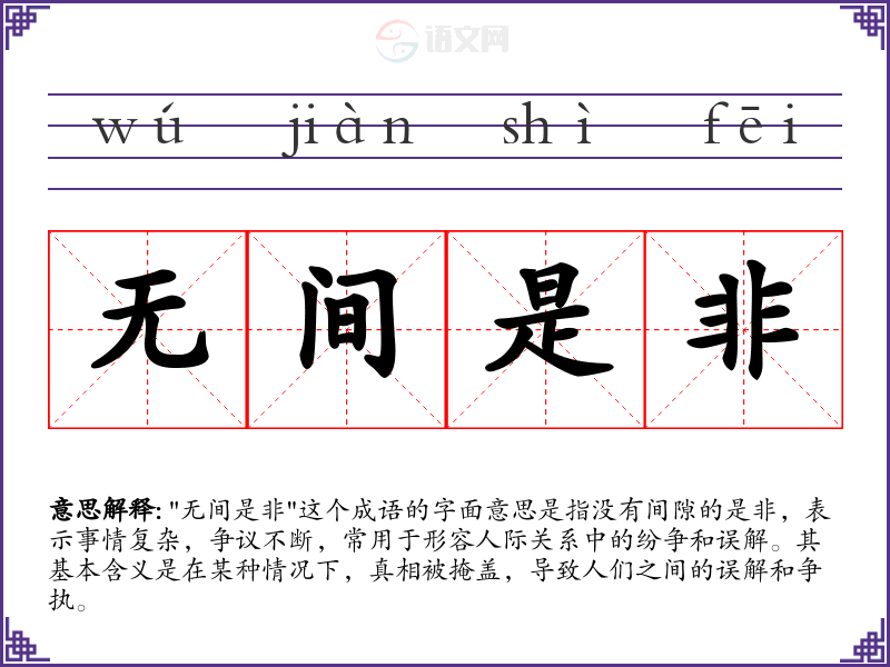 "无间是非"这个成语的字面意思是指没有间隙的是非,表示事情复杂,争议不断,常用于形容人际关系中的纷争和误解。其基本含义是在某种情况下,真相被掩盖,导致人们之间的误解和争执。