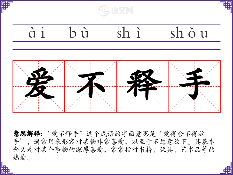 “爱不释手”这个成语的字面意思是“爱得舍不得放手”,通常用来形容对某物非常喜爱,以至于不愿意放下。其基本含义是对某个事物的深厚喜爱,常常指对书籍、玩具、艺术品等的热爱。