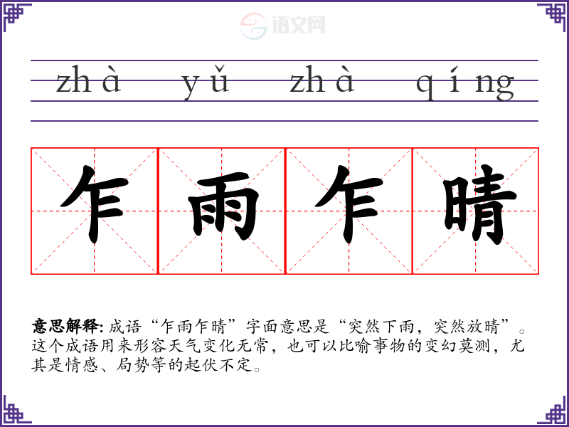 成语“乍雨乍晴”字面意思是“突然下雨,突然放晴”。这个成语用来形容天气变化无常,也可以比喻事物的变幻莫测,尤其是情感、局势等的起伏不定。
