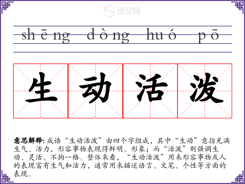 成语“生动活泼”由四个字组成,其中“生动”意指充满生气、活力,形容事物表现得鲜明、形象;而“活泼”则强调生动、灵活、不拘一格。整体来看,“生动活泼”用来形容事物或人的表现富有生气和活力,通常用来描述语言、文笔、个性等方面的表现。