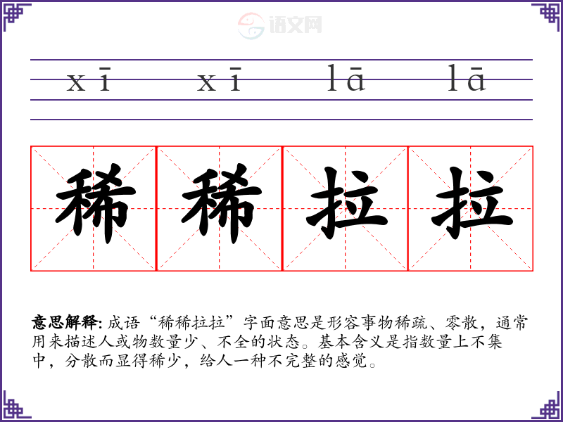 成语“稀稀拉拉”字面意思是形容事物稀疏、零散,通常用来描述人或物数量少、不全的状态。基本含义是指数量上不集中,分散而显得稀少,给人一种不完整的感觉。