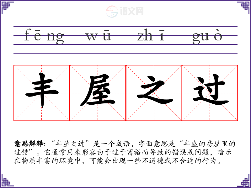 “丰屋之过”是一个成语,字面意思是“丰盛的房屋里的过错”。它通常用来形容由于过于富裕而导致的错误或问题,暗示在物质丰富的环境中,可能会出现一些不道德或不合适的行为。