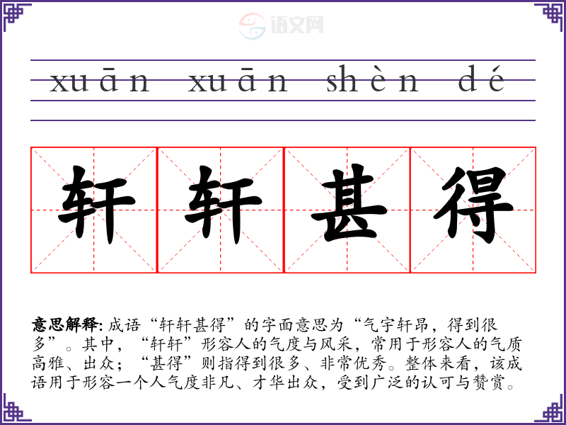 “轩轩甚得”并没有明确的历史典故或文学出处,但可以理解为结合了古代文人对气质和才华的追求,反映了**文化中对人的外在表现和内在修养的重视。成语本身的构成可以追溯到古代文人雅士的言谈举止。