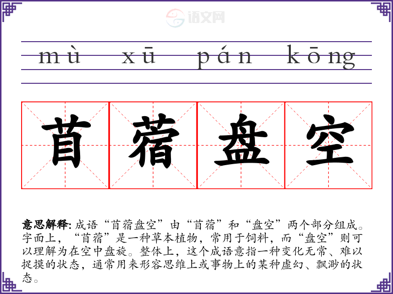 成语“苜蓿盘空”由“苜蓿”和“盘空”两个部分组成。字面上,“苜蓿”是一种草本植物,常用于饲料,而“盘空”则可以理解为在空中盘旋。整体上,这个成语意指一种变化无常、难以捉摸的状态,通常用来形容思维上或事物上的某种虚幻、飘渺的状态。