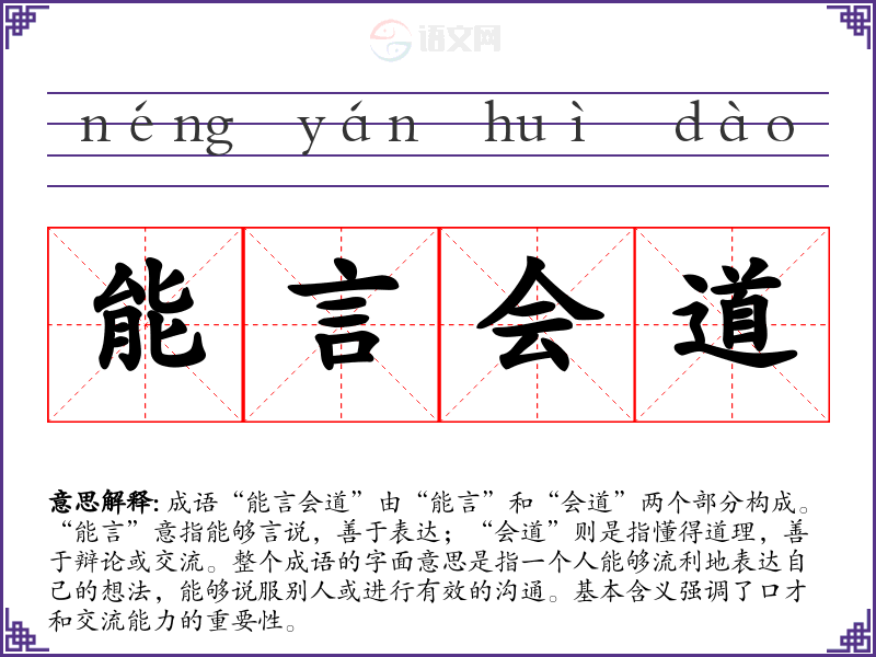 成语“能言会道”由“能言”和“会道”两个部分构成。“能言”意指能够言说,善于表达;“会道”则是指懂得道理,善于辩论或交流。整个成语的字面意思是指一个人能够流利地表达自己的想法,能够说服别人或进行有效的沟通。基本含义强调了口才和交流能力的重要性。