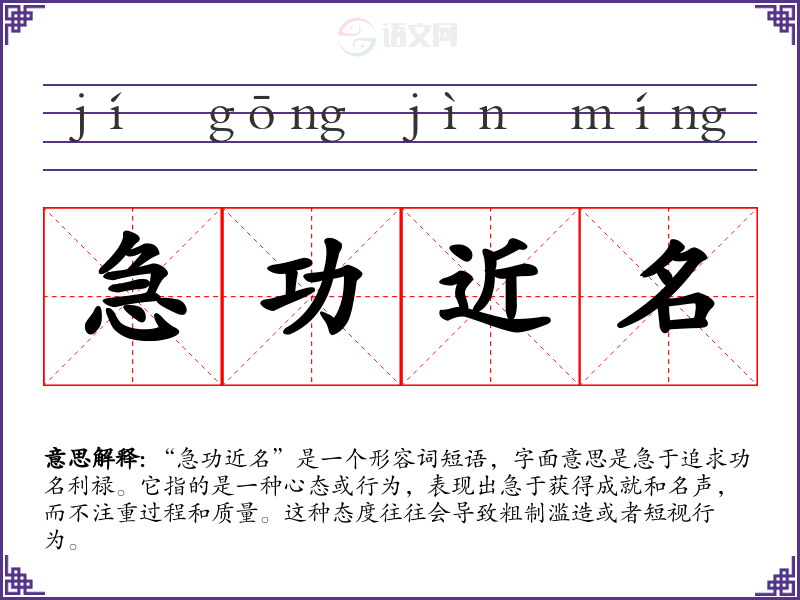 “急功近名”是一个形容词短语,字面意思是急于追求功名利禄。它指的是一种心态或行为,表现出急于获得成就和名声,而不注重过程和质量。这种态度往往会导致粗制滥造或者短视行为。