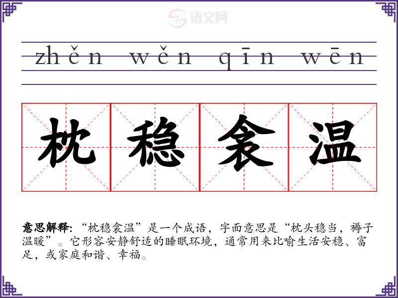 “枕稳衾温”是一个成语,字面意思是“枕头稳当,褥子温暖”。它形容安静舒适的睡眠环境,通常用来比喻生活安稳、富足,或家庭和谐、幸福。