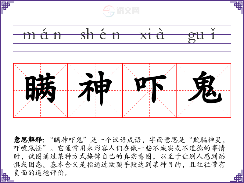 - 欺天罔人:形容欺骗上天和世人,含义与“瞒神吓鬼”相似,都是不诚实的表现。