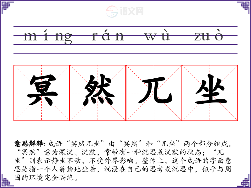 成语“冥然兀坐”由“冥然”和“兀坐”两个部分组成。“冥然”意为深沉、沉默,常带有一种沉思或沉默的状态;“兀坐”则表示静坐不动,不受外界影响。整体上,这个成语的字面意思是指一个人静静地坐着,沉浸在自己的思考或沉思中,似乎与周围的环境完全隔绝。