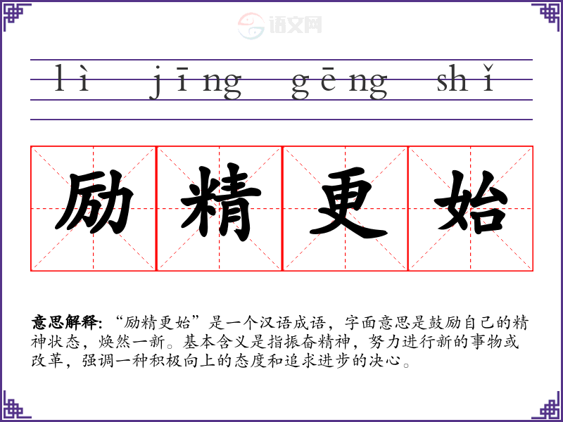 “励精更始”是一个汉语成语,字面意思是鼓励自己的精神状态,焕然一新。基本含义是指振奋精神,努力进行新的事物或改革,强调一种积极向上的态度和追求进步的决心。