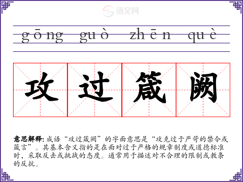 成语“攻过箴阙”的字面意思是“攻克过于严苛的禁令或箴言”。其基本含义指的是在面对过于严格的规章制度或道德标准时,采取反击或挑战的态度。通常用于描述对不合理的限制或教条的反抗。