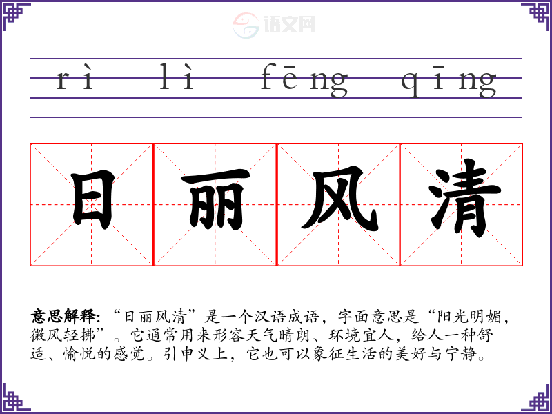 “日丽风清”是一个汉语成语,字面意思是“阳光明媚,微风轻拂”。它通常用来形容天气晴朗、环境宜人,给人一种舒适、愉悦的感觉。引申义上,它也可以象征生活的美好与宁静。