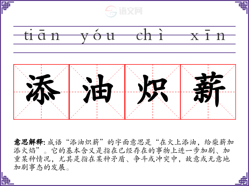 成语“添油炽薪”的字面意思是“在火上添油,给柴薪加添火焰”。它的基本含义是指在已经存在的事物上进一步加剧、加重某种情况,尤其是指在某种矛盾、争斗或冲突中,故意或无意地加剧事态的发展。