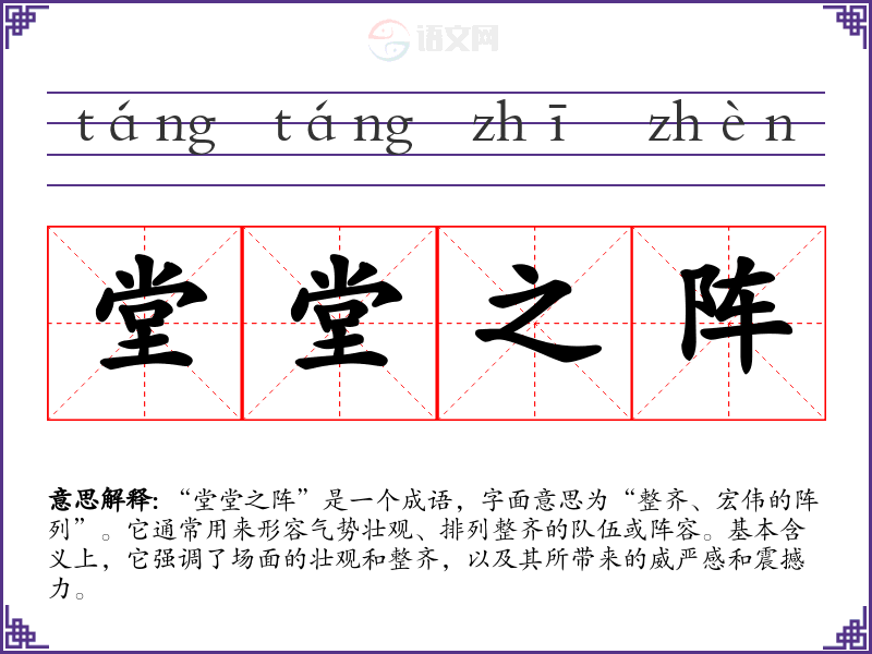 通过对“堂堂之阵”的学,我认识到它不仅是一个描述场面的成语,更是对集体力量、组织性和气势的深刻理解。在语言学中,掌握这样的成语可以丰富表达,让语言更具表现力和感染力。