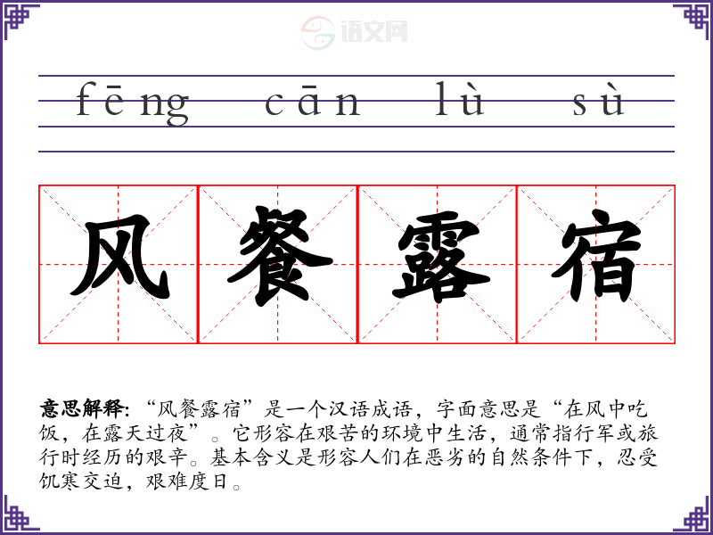 “风餐露宿”是一个汉语成语,字面意思是“在风中吃饭,在露天过夜”。它形容在艰苦的环境中生活,通常指行军或旅行时经历的艰辛。基本含义是形容人们在恶劣的自然条件下,忍受饥寒交迫,艰难度日。
