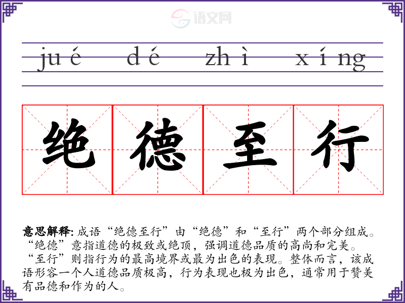 成语“绝德至行”由“绝德”和“至行”两个部分组成。“绝德”意指道德的极致或绝顶,强调道德品质的高尚和完美。“至行”则指行为的最高境界或最为出色的表现。整体而言,该成语形容一个人道德品质极高,行为表现也极为出色,通常用于赞美有品德和作为的人。