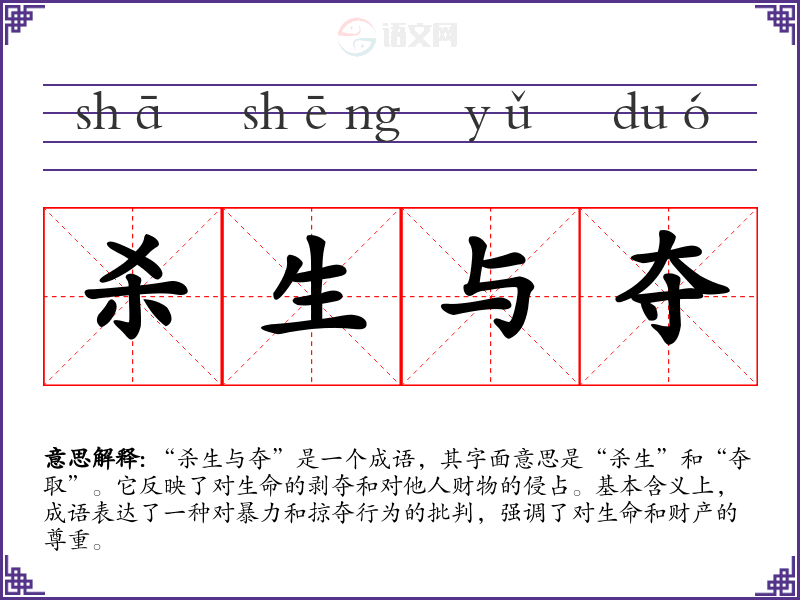 “杀生与夺”是一个成语,其字面意思是“杀生”和“夺取”。它反映了对生命的剥夺和对他人财物的侵占。基本含义上,成语表达了一种对暴力和掠夺行为的批判,强调了对生命和财产的尊重。