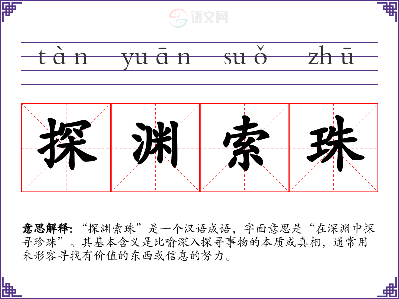 “探渊索珠”是一个汉语成语,字面意思是“在深渊中探寻珍珠”。其基本含义是比喻深入探寻事物的本质或真相,通常用来形容寻找有价值的东西或信息的努力。