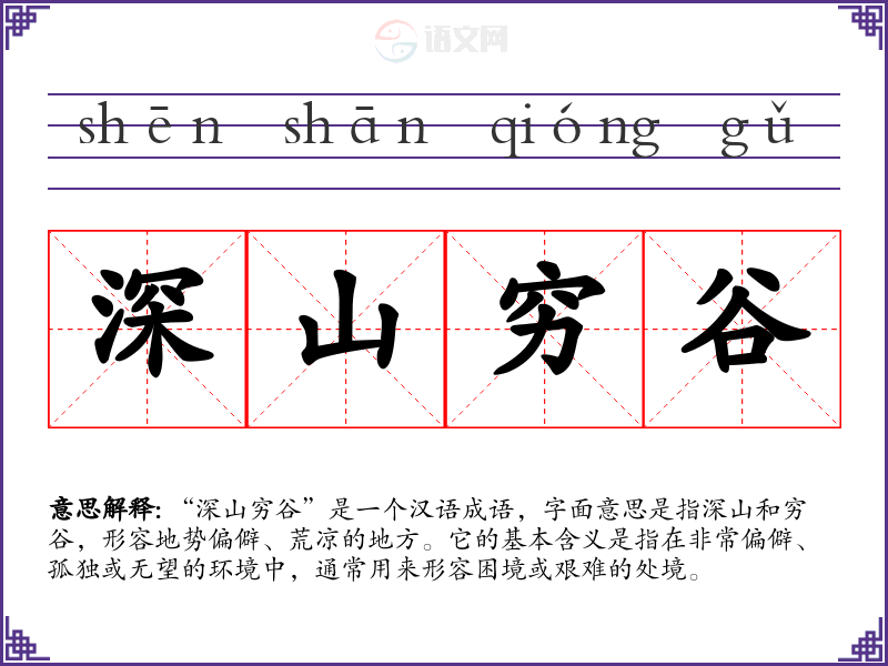 “深山穷谷”是一个汉语成语,字面意思是指深山和穷谷,形容地势偏僻、荒凉的地方。它的基本含义是指在非常偏僻、孤独或无望的环境中,通常用来形容困境或艰难的处境。