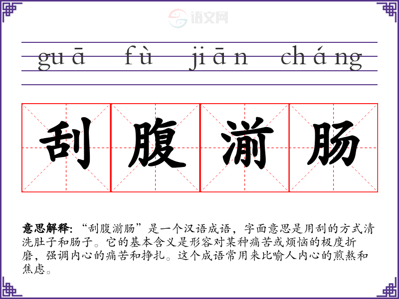 “刮腹湔肠”是一个汉语成语,字面意思是用刮的方式清洗肚子和肠子。它的基本含义是形容对某种痛苦或烦恼的极度折磨,强调内心的痛苦和挣扎。这个成语常用来比喻人内心的煎熬和焦虑。