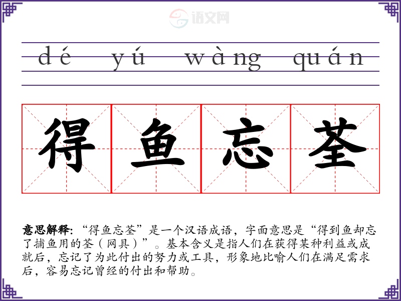 “得鱼忘荃”是一个汉语成语,字面意思是“得到鱼却忘了捕鱼用的荃(网具)”。基本含义是指人们在获得某种利益或成就后,忘记了为此付出的努力或工具,形象地比喻人们在满足需求后,容易忘记曾经的付出和帮助。