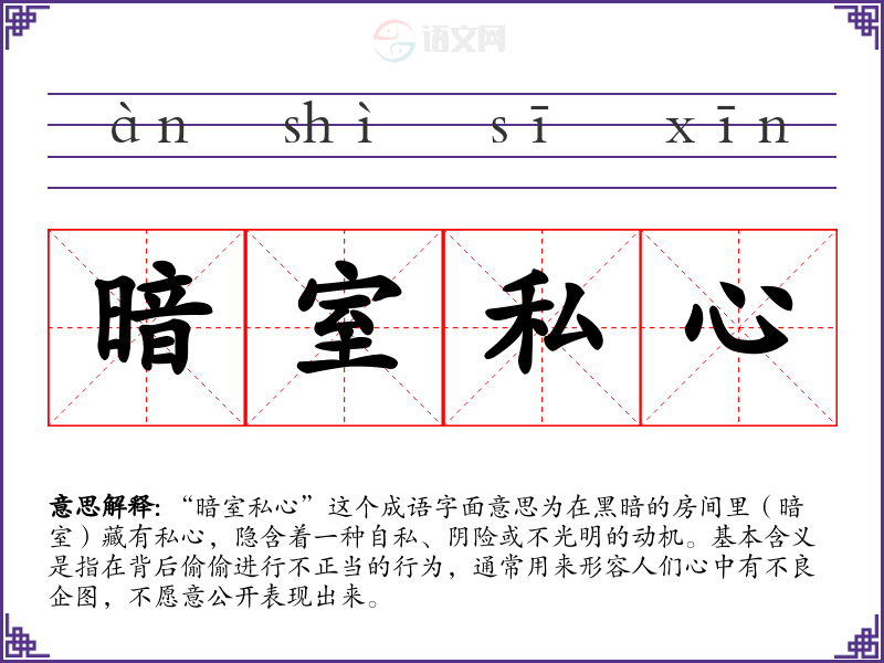 “暗室私心”这个成语字面意思为在黑暗的房间里(暗室)藏有私心,隐含着一种自私、阴险或不光明的动机。基本含义是指在背后偷偷进行不正当的行为,通常用来形容人们心中有不良企图,不愿意公开表现出来。