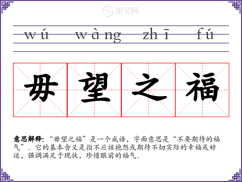 “毋望之福”是一个成语,字面意思是“不要期待的福气”。它的基本含义是指不应该抱怨或期待不切实际的幸福或好运,强调满足于现状,珍惜眼前的福气。