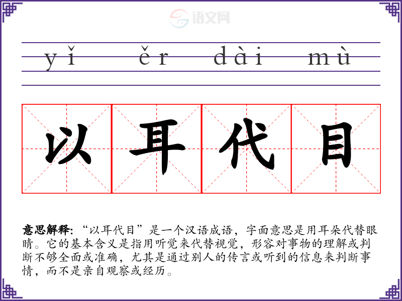 “以耳代目”是一个汉语成语,字面意思是用耳朵代替眼睛。它的基本含义是指用听觉来代替视觉,形容对事物的理解或判断不够全面或准确,尤其是通过别人的传言或听到的信息来判断事情,而不是亲自观察或经历。