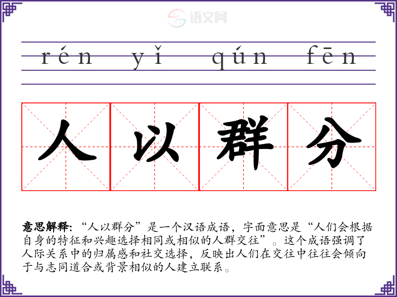 “人以群分”是一个汉语成语,字面意思是“人们会根据自身的特征和兴趣选择相同或相似的人群交往”。这个成语强调了人际关系中的归属感和社交选择,反映出人们在交往中往往会倾向于与志同道合或背景相似的人建立联系。