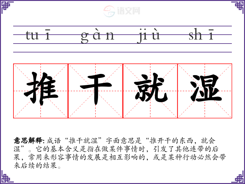 成语“推干就湿”字面意思是“推开干的东西,就会湿”。它的基本含义是指在做某件事情时,引发了其他连带的后果,常用来形容事情的发展是相互影响的,或是某种行动必然会带来后续的结果。