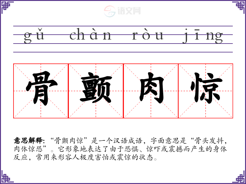 “骨颤肉惊”是一个汉语成语,字面意思是“骨头发抖,肉体惊恐”。它形象地表达了由于恐惧、惊吓或震撼而产生的身体反应,常用来形容人极度害怕或震惊的状态。