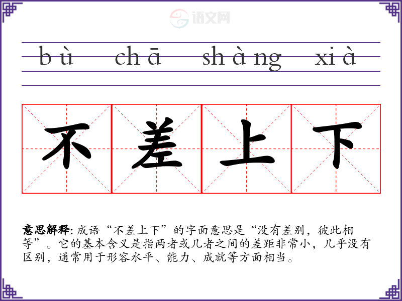 成语“不差上下”的字面意思是“没有差别,彼此相等”。它的基本含义是指两者或几者之间的差距非常小,几乎没有区别,通常用于形容水平、能力、成就等方面相当。