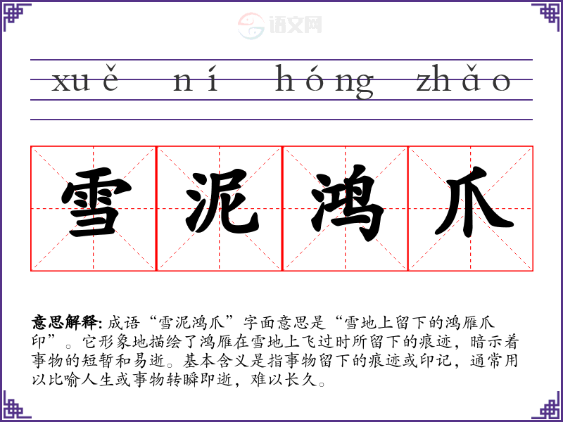 成语“雪泥鸿爪”字面意思是“雪地上留下的鸿雁爪印”。它形象地描绘了鸿雁在雪地上飞过时所留下的痕迹,暗示着事物的短暂和易逝。基本含义是指事物留下的痕迹或印记,通常用以比喻人生或事物转瞬即逝,难以长久。