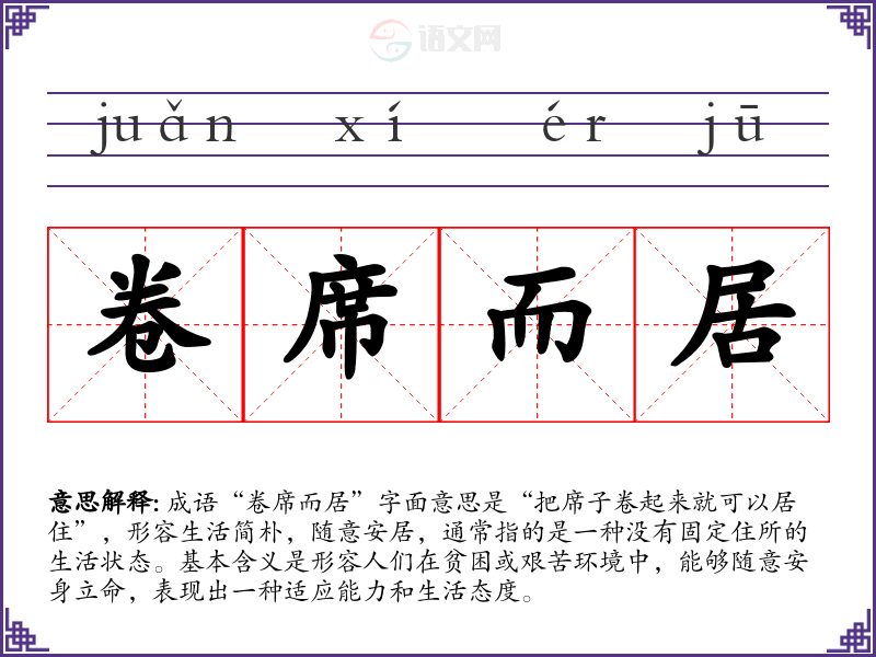 成语“卷席而居”字面意思是“把席子卷起来就可以居住”,形容生活简朴,随意安居,通常指的是一种没有固定住所的生活状态。基本含义是形容人们在贫困或艰苦环境中,能够随意安身立命,表现出一种适应能力和生活态度。