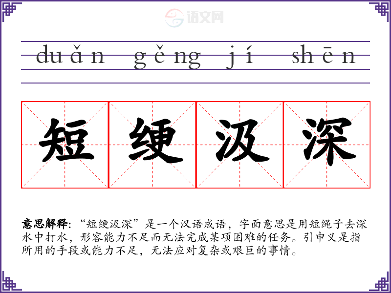 “短绠汲深”是一个汉语成语,字面意思是用短绳子去深水中打水,形容能力不足而无法完成某项困难的任务。引申义是指所用的手段或能力不足,无法应对复杂或艰巨的事情。
