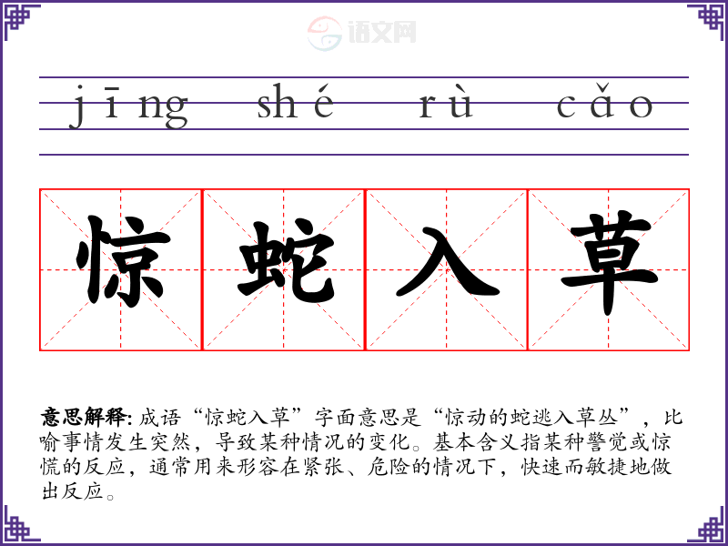 成语“惊蛇入草”字面意思是“惊动的蛇逃入草丛”,比喻事情发生突然,导致某种情况的变化。基本含义指某种警觉或惊慌的反应,通常用来形容在紧张、危险的情况下,快速而敏捷地做出反应。