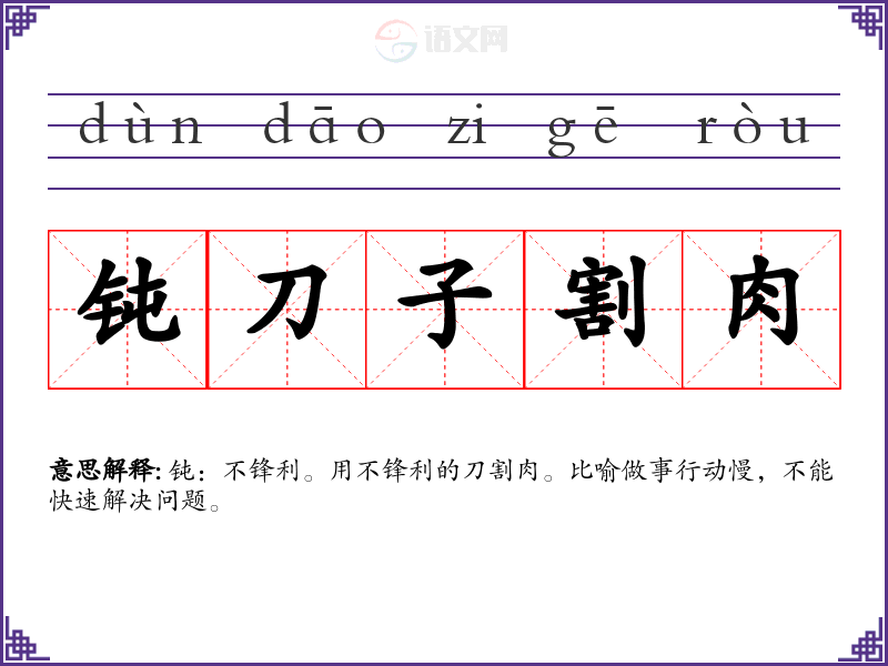钝:不锋利。用不锋利的刀割肉。比喻做事行动慢,不能快速解决问题。