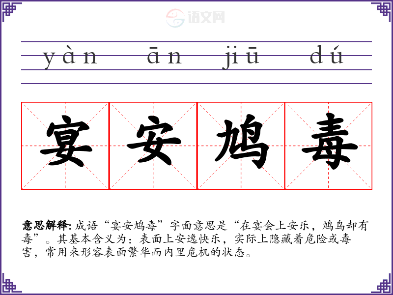 成语“宴安鸠毒”字面意思是“在宴会上安乐,鸠鸟却有毒”。其基本含义为:表面上安逸快乐,实际上隐藏着危险或毒害,常用来形容表面繁华而内里危机的状态。