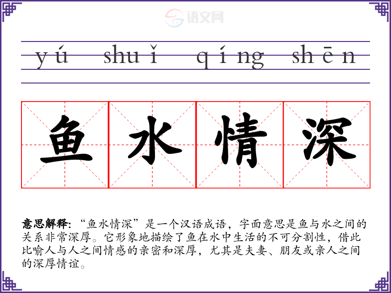 “鱼水情深”是一个汉语成语,字面意思是鱼与水之间的关系非常深厚。它形象地描绘了鱼在水中生活的不可分割性,借此比喻人与人之间情感的亲密和深厚,尤其是夫妻、朋友或亲人之间的深厚情谊。