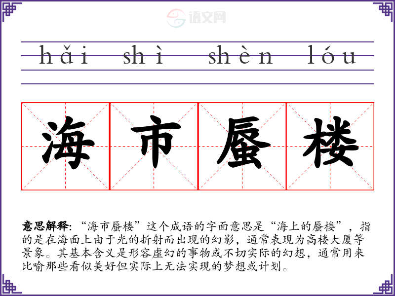 “海市蜃楼”这个成语的字面意思是“海上的蜃楼”,指的是在海面上由于光的折射而出现的幻影,通常表现为高楼大厦等景象。其基本含义是形容虚幻的事物或不切实际的幻想,通常用来比喻那些看似美好但实际上无法实现的梦想或计划。